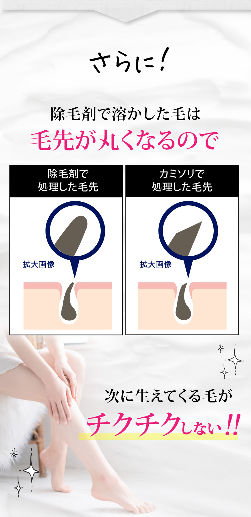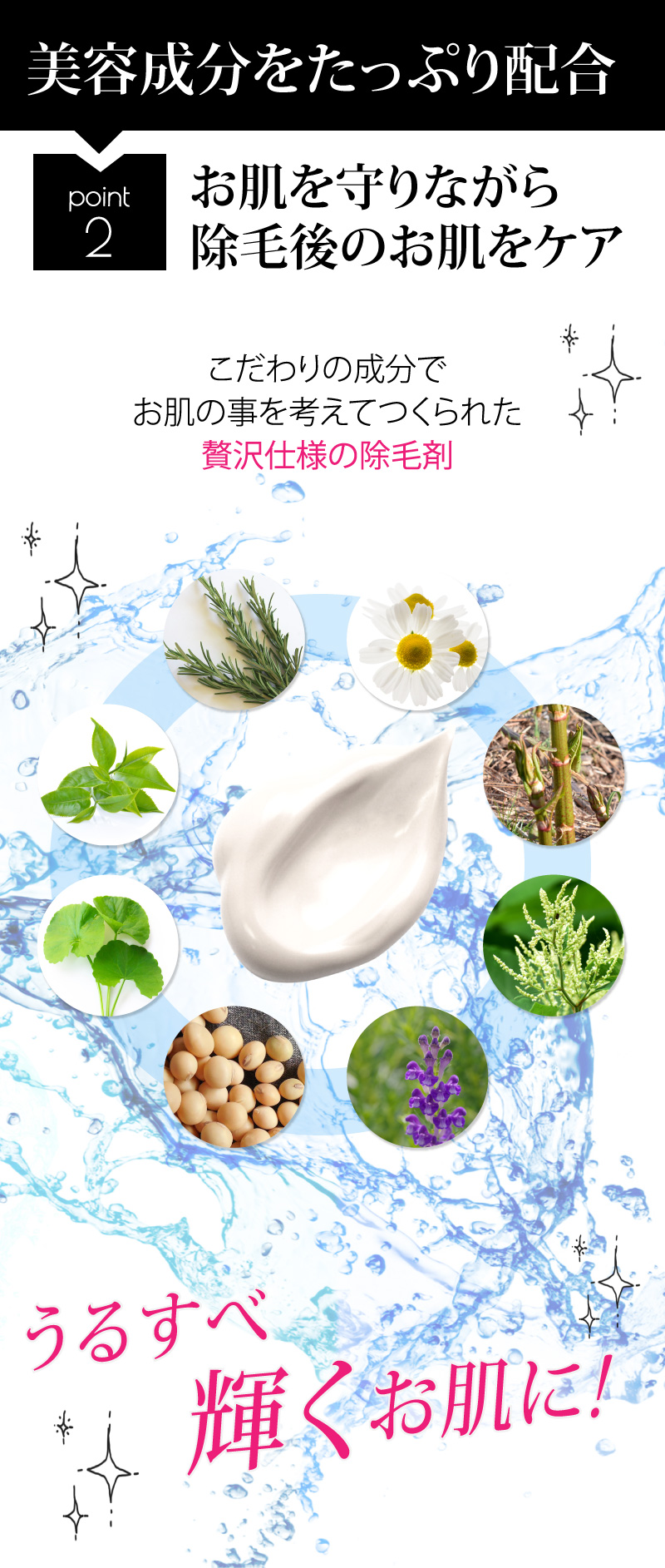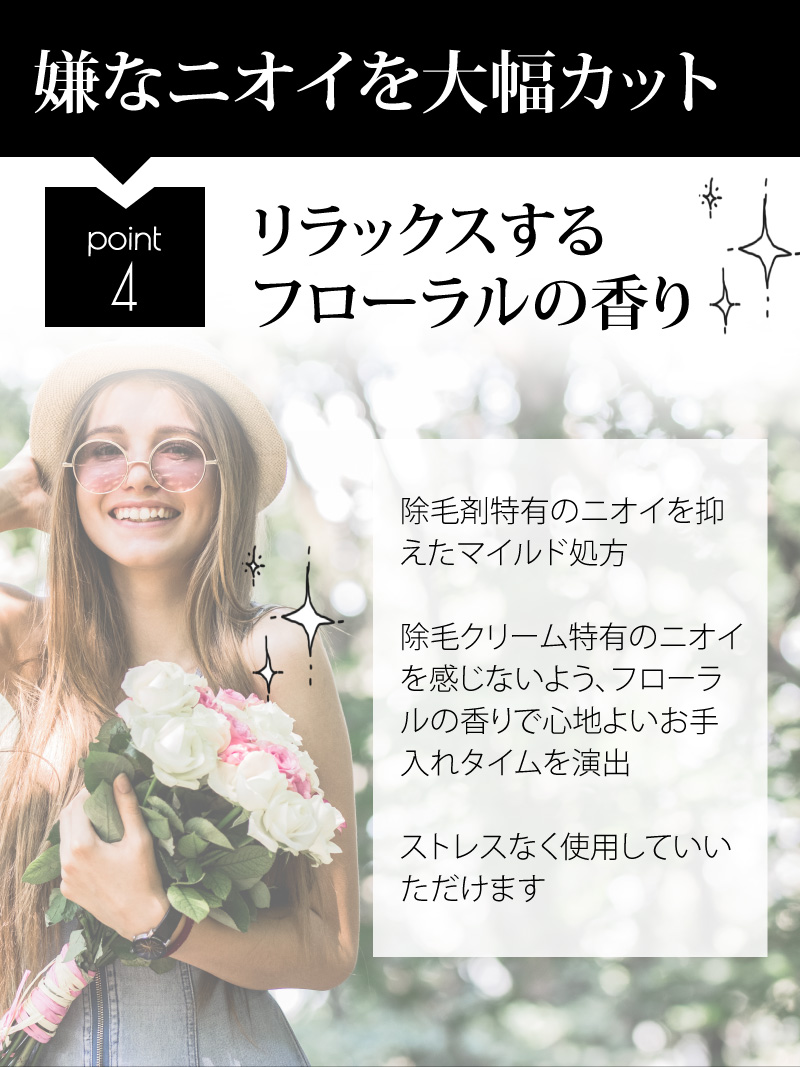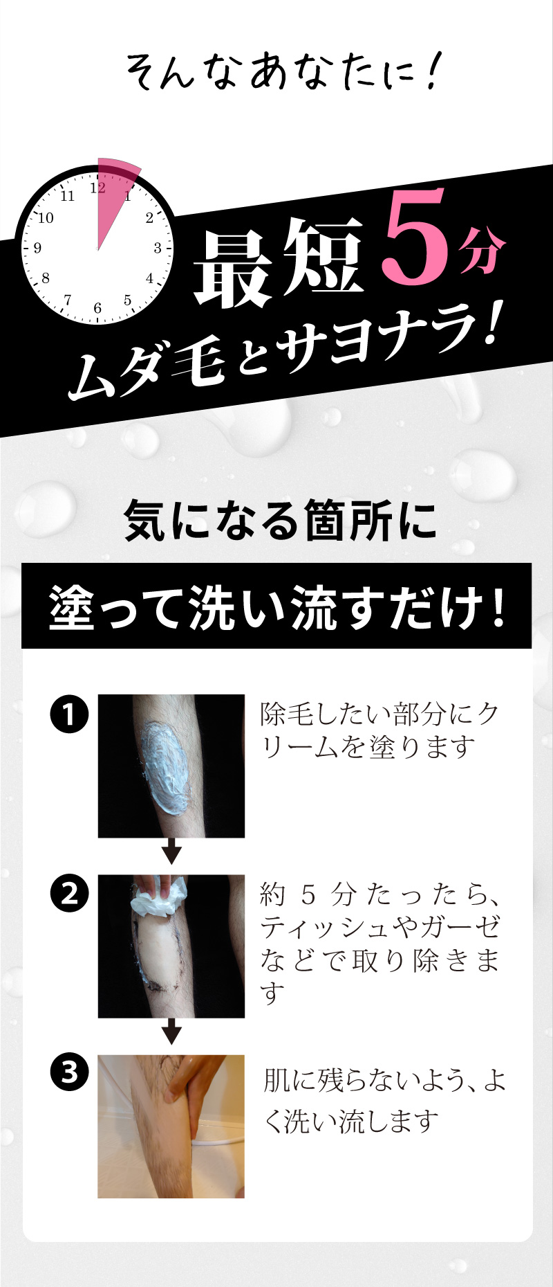 | ご使用方法 | 除毛する部位に毛が覆われる位の厚さ(1?3mm程度)をムラなく塗布し、通常5-10分間放置した後、ヘラあるいは脱脂綿、ガーゼなどで取り除く。その後除毛した部分を濡らした脱脂綿、ガーゼなどで清拭するか、あるいは湯水などで洗い流す。 ※毛の根元に本品が行きわたらず、毛の途中からつけた場合は完全に除毛できませんのでご注意ください。  |