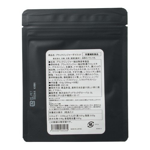 ブラックジンジャー抽出物(黒ウコンエキス、デキストリン)、生姜末、トマト抽出エキス、黒コショウ抽出物、シトラスアランティウムエキス末、ヒハツエキス末、ザクロ種子エキス末、チオクト酸、L-カルニチン酒石酸塩/セルロース、活性炭、ステアリン酸カルシウム、香辛料抽出物、微粒酸化ケイ素、L-チロシン、L-バリン、L-ロイシン、L-イソロイシン、シクロデキストリン